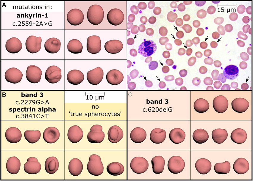 Three patients diagnosed with hereditary spherocytosis caused by different mutations (panels A–C) showed a spherocyte count of 11% (A), 8% (B), and 10% (C) in their stained peripheral blood smears, as exemplified in panel A (arrows, objective-magnification 100x).